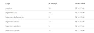 Ao todo, serão 184 vagas distribuídas entre seis cargos. A maior parte é para engenheiros civis, mas também há oportunidades para arquitetos e médicos do trabalho. Os salários variam de R$ 11.186,00 a R$ 14.915,00.