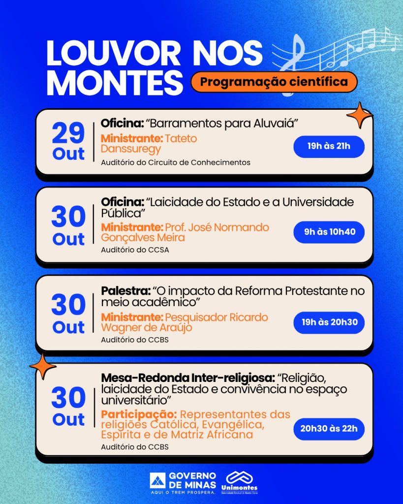 A União Bíblica dos Estudantes em Missão (UBEM), por meio da Universidade Estadual de Montes Claros (Unimontes) realiza, entre os dias 29 e 31 de outubro, o evento “Louvor nos Montes”, que propõe um espaço de integração entre arte, cultura e conhecimento, estimulando o diálogo entre ciência e religiosidade. A programação inclui oficinas, palestras e mesas-redondas, com a participação de acadêmicos, professores, servidores e convidados de diferentes tradições religiosas e áreas do saber.